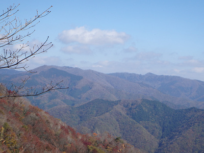紅葉 さて。坑道跡を出発、周囲に広がる紅葉を眺めながら慎重に高度を下げる。途中で山際付近に安蔵寺山を眺めるが、すぐに視界から隠れてしまった。坑道跡から10分程度で今度は竪穴の坑道跡を眺める。この坑道は大岩横にあり、坑道入口はふさがれている。 竪穴跡を出発し、左右にシダの茂る道を下ると、錦町観光協会による「小五郎山鉱山跡について」と言う案内が置かれている。案内板を過ごし、頭上に紅葉を楽しみながら下山を続ける。やがて左に展望台の大岩が現れるので立ち寄り、木の間越しながら、向かいにそびえる山々などを眺める。