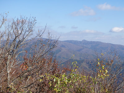 明るい尾根道を歩いていると、前方に小五郎山の山裾が見えてきた。残念ながら紅葉は終わりかけている。また、山裾の右には寂地山、その右には特徴的な山容の吉和冠山がそびえている。