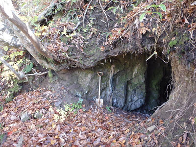 山頂から10分程度で坑道跡の分岐へ到着、ここで進路を右(北)へ採れば坑道跡の前に着く。ヘッドライトを灯して本コースのハイライトの坑道探検をしたが、この探検はライトの光が強ければ安心である。