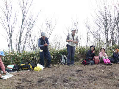 やがて小五郎山の山頂に到着、総勢26名での記念撮影は少々時間がかかる。その後山頂にてフルートとハモニカの演奏を聞く。周囲に広がる展望は黄砂により少々霞んでいるが、寂地山、吉和冠山、大峰山、鬼ヶ城山、羅漢山は確認する事ができた。また、北西には木の間越しながら白旗山と安蔵寺山、これは充分満足できる展望である。