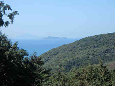 進路は緩やかに左カーブを描きこの先で折り返すように右へ変わる。広く切り開かれたような真砂の道を進むと西には蓋井島が顔を出す。間もなく樹林の下に登山道入口が現れ、頂上まで650mと案内されている。ここで作業道歩きは終了し、登山道に入る。