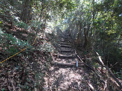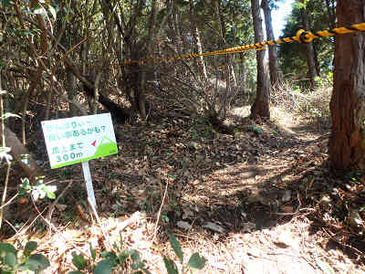 すぐに急登が始まり虎ロープを補助に高度を上げる。山腹につけられた道を進むのだが、なにせ急勾配。更に登山道が右側に傾斜しているので慎重に歩を進める。まさに一直線という感じの道が続くのでゆっくり歩きを続け、間もなく明るい場所に出る。周囲の木々が伐採されているものの、もう少し高度を上げないと視界は限られている。着いたところは頂上まで500m地点、急登に喘いだので小休止を取る。