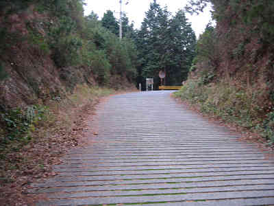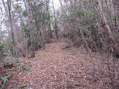 石垣の組まれた場所を過ぎると少し斜面が急になる。足下には沢山の落ち葉が積もっており、滑らないように注意しながら進んで行く。登山口から10分程度でシダの繁る場所を通過、平坦な道に着くと歩きやすくなってきた。シダの繁る道を通過後、山腹を右(北)に向かうようになるが、すぐ(シダの道を抜けて2〜3分程度)に左手の斜面に向かわないといけない。この斜面に取り付く場所には何の目印もなく、ただ踏み跡がある程度なので、充分注意を払う必要がある。この入口さえ判れば、後は踏み跡に従って進むことになり、この先道を間違えることは無い。