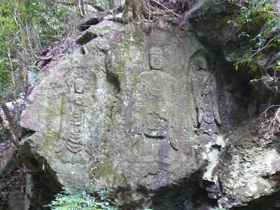 史跡 地獄谷石窟仏 仁徳天皇の承和8年(842年)以来、春日大社の神域として狩猟伐採が禁じられてきたため、原始林となり、国の天然記念物に指定されている。間もなく地獄谷石窟仏の前へ到着、案内には、『地獄谷石窟仏は、凝灰岩をくり抜いた石窟で、側面に仏像が線刻されている。聖(ひじり)が住んでいたという伝承があり、聖人窟ともよばれる。 地獄谷石窟仏の風景 向かって右側壁、妙見菩薩座像、奥壁右 十一面観音像、中央 廬舎那仏、右 薬師如来。弥勒仏は石仏で作られることから、中央は弥勒仏という各諸説がある。今も彩色などが残っている。』と記されている。