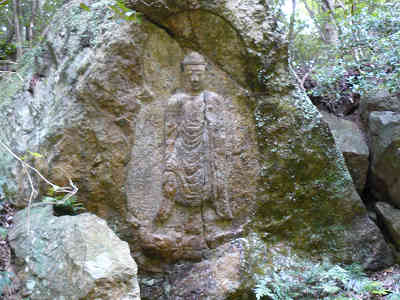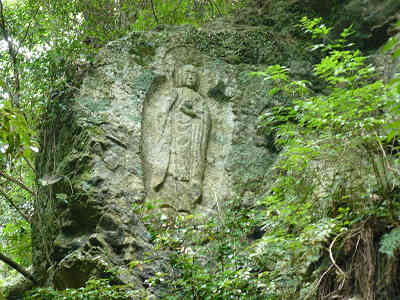 朝日観音の風景 休憩の後、苔むす石畳の道を下ると朝日観音の前に着く。対岸の岸壁に掘られている朝日観音は、早朝高円山の頂からさしのぼる朝日に真っ先に照らされていることから名付けられたものである。実際には観音ではなく、中央は弥勒仏、左右は地蔵仏である。