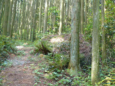 いざり岩を過ごし、少しずつ南へ向かって進み、高度を上げる。植林帯の下を進み、背後を振り返れば、植林の中に霊気を感じるような気がする。やがて少しずつ坂の傾斜が増し、樹林の茂る場所を抜ければ、右から道が合流する。