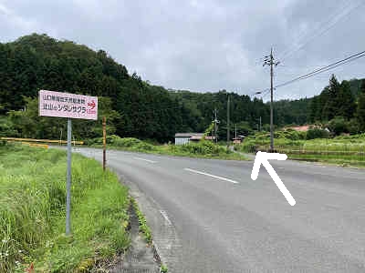 県道を道なりに1.5km進むと「直進が福賀6km、左折が広域農道」の案内に出会う。この分岐は広域農道へ向かって左折、農道を1.3km進むと辻山地区に入り、道端にシダレザクラへ1.5kmの案内が立っている。この案内に従い進むと右に再び案内が現れるので分岐を右折、間もなく水道施設横に着くので車を置いて登山を開始する。