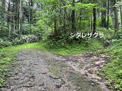 作業道のような広い道を進むとすぐに右への分岐に出会う。これが辻山のシダレザクラで、下山時にゆっくり眺めようかと思っていたが、あまりにも大きく美しい枝振りなので登山前に見学することにした。とても大きいシダレザクラは一見の価値があり、お花見時期に眺めれば感動することは間違いないだろう。県指定天然記念物で樹高15.8m、目通り樹囲226cm、根廻り約320cmの県下でも有数の桜の巨木である。