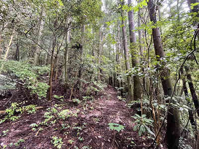 さて、権現山へ向かう。作業道はこの先から笹が茂るので笹を分けて進み、足下には大葉擬宝珠のつぼみを見つけた。梅雨真っ盛りの時期なので足下には草が茂り、周囲にも樹木が茂り慎重に足場を選びながら進む。ただし、作業道歩きなので道を間違える心配は無い。緩やかな傾斜の道を進んでいると作業道終点に到着、この先からは尾根道に入る。