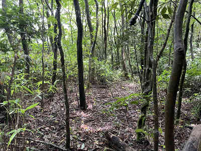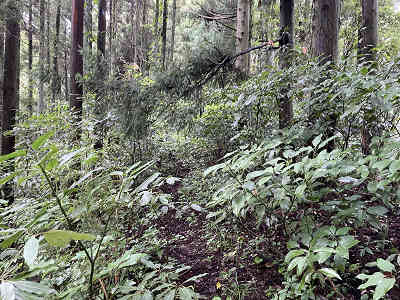 更に進むと鳥居の倒壊した場所に到着、この鳥居などのある場所が地図上の鳥居マークの位置であり、権現山の山頂を踏んだと言うことである。山頂から元来た道を引き返し、坂を下る手前で進路を南東にとり、祠へ向かってみる。