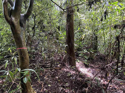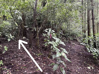 この方面には目印のテープが配置され、目印に従い登れば道を外すことは無い。樹林の中に続く道を辿ればすぐに坂の傾斜が緩み、平坦な尾根に着いた。尾根道を北東へ向かって進んでいると、広く平坦な場所を通過するが、この付近が592mの標高点のようだ。