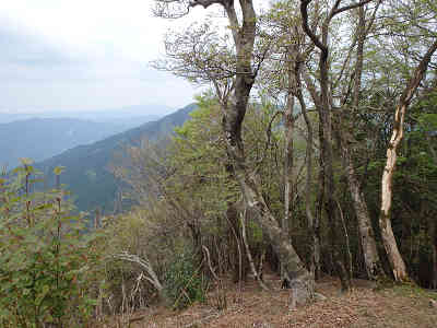 屏山山頂の風景 屏山から眺める展望(クリックで拡大) 東には馬見山の山頂がのぞいており、いずれこの山頂にも立つ予定である。足下にはヒトリシズカが咲いており、可憐な白い花が屏山の山頂に似合っているようだ。三等三角点の前で記念撮影、これで本日の登山予定は終了である。明るい山頂を出発し、奥の院・大将隠しのところで、キャンプ場への分岐案内を見つけたが、下山するポイントが不明なので元来た道を引き返すことにした。