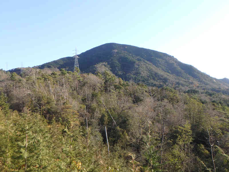 展望地から少し進むと右からの分岐と出会う。ここには巡視路の標柱が置かれていた。この先から頭上を樹林が覆い、少し坂の傾斜が増す。足下は滑り易い赤土状の道に変わるので慎重に足場を選びながら高度を上げる。やがて前方に送電鉄塔が現れ、この下に着くと樹間越しながら小田山を眺めることができた。