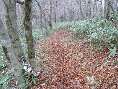 この先で檜の植林帯を通過すると、左手に植林帯、右手に自然林を眺めながら進むことになる。ほとんど平坦な登山道なので疲労感無く進むことが出来る。突然冬枯れの自然林の中に出ると正面には杉の植林帯が待っていた。植林帯の下に付けられた道を過ぎればいよいよ急な坂道が始まる。