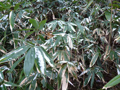 更に周囲を観察すれば笹の上には霰が残り、なんとも言えない美しさ。急な斜面を下りて行けばすぐに杉の植林帯へ入る。間もなく眼下に大岩が見えてきた。これが有名な大神岩、注連縄の張られた大岩をいろいろな角度から観察し更に下りて行く。滑り易い道を下りて行けば今度は弦の清水。銘水なのだが本日はあまりに寒すぎる。昨日来の雨の事も考慮し飲むのは差し控えた。