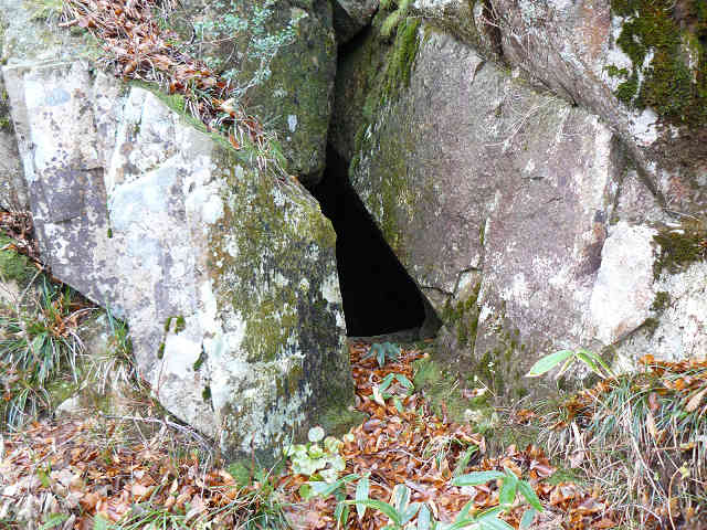 途中に聳える大岩を観賞、更に細い道を進んで行き、急な斜面をゆっくり登れば左手に階段が続いている。これは大国主命の御琴があったと伝えられる、八合目の「琴の岩屋」へ続く階段である。階段を登れば正面に祠が建ち、右手に琴の岩屋(穴神琴弾岩)が待っていた。早速岩屋に入ってみると中は狭く暗い。足下は階段のようになっており、伝説の御琴(みこと)を探しに少し下りてみたが、岩屋の先は狭くなっていたので引き返した。
