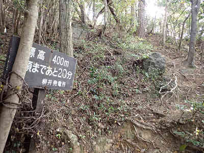 急登が続くので焦らず登っていると、突然という感じで周囲が明るくなり、樹間越しながら大島方面が見えてきた。わずかでも展望が広がると元気が出るものである。やがて標高400mの案内に着くと、山頂まで20分と書かれており、この先から少し坂の傾斜が緩む。