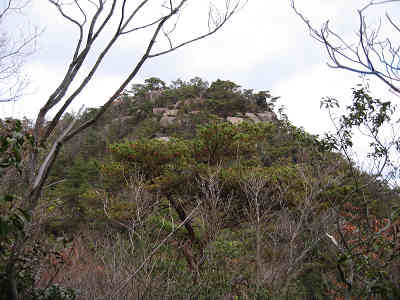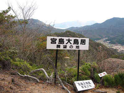 0号峰から眺める2号以降の峰 鞍部から2号峰に向かう途中に6人程度のパーティーとすれ違う。東登山口から登ってきた人達である。間もなく宮島大鳥居展望の地の標識のある場所に着く。ちょうど向かいの山裾右手に朱の大鳥居を眺めることが出来た。朱色というのは本当に目立つ色であることを実感、直線距離で10km以上先の大鳥居がはっきり見える。