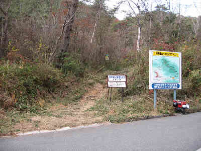 舗装道を更に奥に進んで行き、石山への分岐を右に見た先に河平連山の登山口を見つける。左手に広場があるので車を置き登山を開始する。分岐を右に取り、広い林道のような道に入ると右手に「河平連山(飛行機山)登山口」の標識を過ごす。
