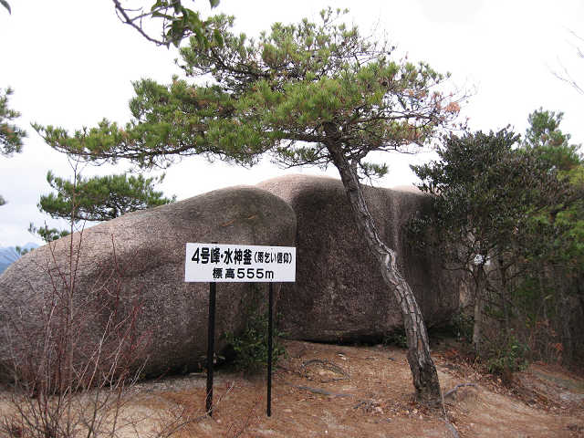 3号峰を下り鞍部に行く途中に眺める4号峰は素晴らしい岩峰で、登るのが勿体ないような素晴らしい山容だ。これからあの岩峰に登って行くのだと思うと再びワクワクする。今日は何回ワクワクするのだろう、急な斜面を楽しみながら登って行くと松の多い尾根となり、すぐに水神釜(雨乞い信仰)の標識のある4号峰に到着した。