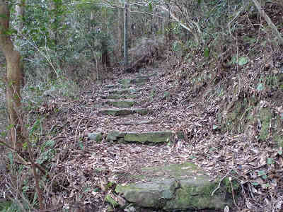 右に梅田治輔翁頌徳碑を過ごし、少し先で階段を登れば祠と注連縄の渡された大岩が現れる。この横を通って細いコンクリートの道を辿れば、コンクリート製の階段が続いている。更に御影石の並べられた階段を登り切ると進路は右へ向き、鳥居の笠木の部分が欠落し、左右に柱のみが残った場所を通過する。