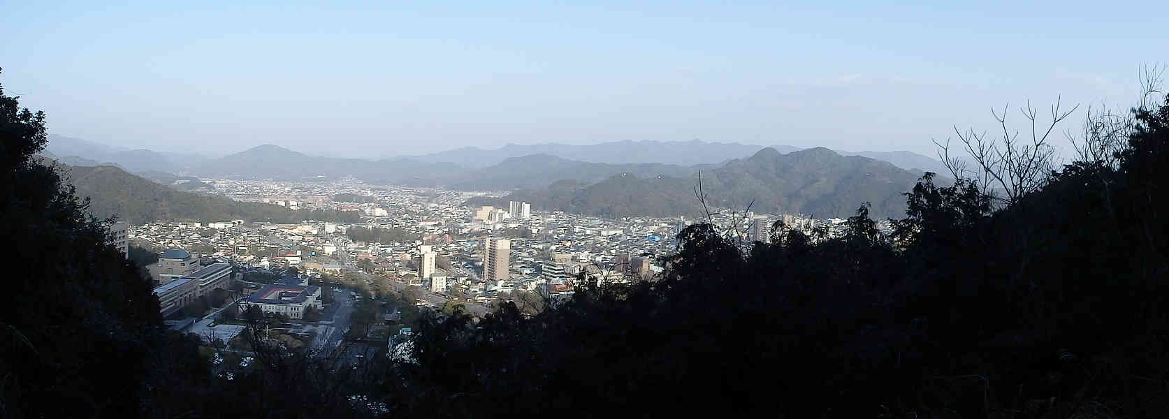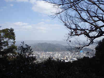 北に広がる展望を眺めながらコンクリート舗装の道を進み、舗装の切れたところから左側へ折り返す。木の根の目立つ道を辿って高度を上げれば、南に山口市街の展望が広がる。木の間越しながら眼下にサビエル記念聖堂、南東には大内御堀地区、その先には面貌山が端正な山容を見せている。東屋の展望地から眼下に広がる展望を眺めて小休止を取り、山頂を目指す。 東屋の建つ展望地と眼下に広がる展望(クリックで拡大)
