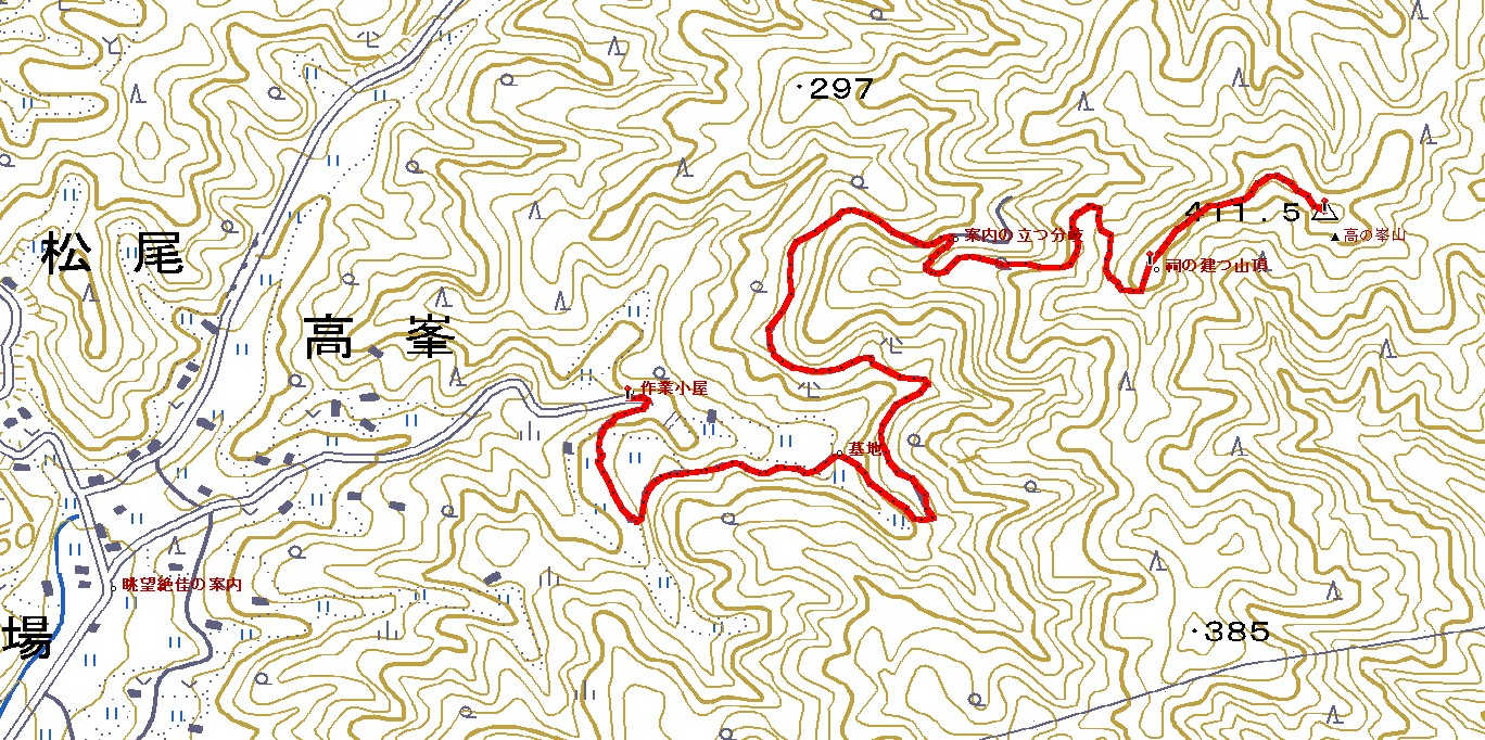 2011年5月4日 作業小屋(作業道入口) →0:30→ 林道分岐 →0:20→ 祠のある山頂 →0:07→ 三角点 →0:06→ 山頂 →0:10→ 林道分岐 →0:20→ 作業小屋 全歩行時間 1時間33分 出雲市大東町の高の峯山へ向かう。以前この付近を散策した際、眺望絶佳の案内に惹かれていつか登ろうと思っていた山である。