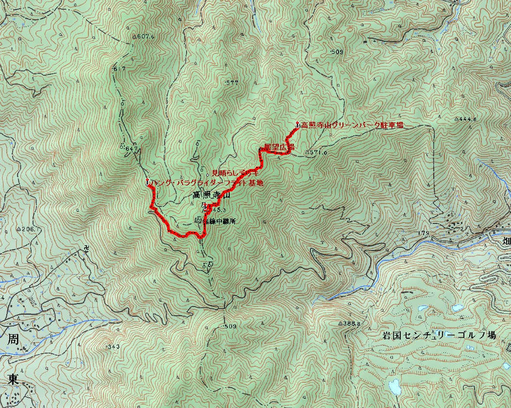なお、高照寺山山頂からグリーンパークの多目的広場に向かう場合の行程の詳細は以下の通りである。 高照寺山山頂へは玖珂方面より国道437号を大島大橋方面に向かって南下し、周東町祖生地区に入る。間もなく高照寺山の標識に従い左折し県道115号に入る。橋を渡ると左手には高照寺山登山口標識が立ち、高照寺山6km・ハング・パラグライダー基地の標識が立っている。