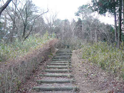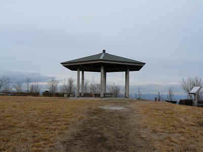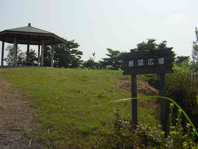 舗装道を進むとその先は砂利の敷かれた駐車場であり、ここまで多目的広場から車で進入できるようだ。更に横木の階段を登ると展望広場に到着する。広場からは北方向にジクザグな道を下りて行き、その先で展望広場の標識に従い左折する。