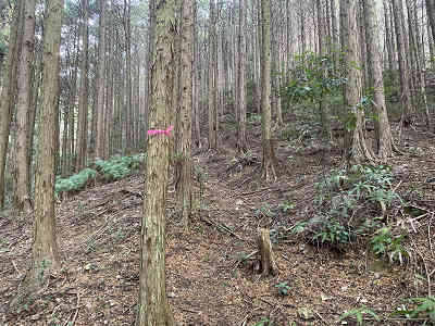 ゴルフバッグの横から植林の下を進み、少し進んだところで目印テープに従い進路を左にとる。登山道はジグザグを描きながら高度を上げる。この道は山仕事の道を利用しているようで、斜度は急だがとても歩きやすくなっている。