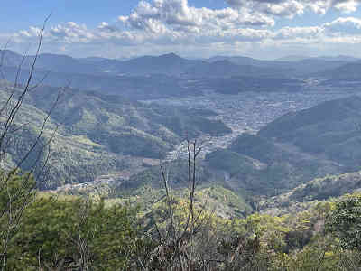 岩の間を通って高度を上げれば玖珂の街並みや氷室岳が顔を出す。やがて進路はシダを避けて東へ向き、北へ向くところで右下に展望所の案内を見つけた。少し坂を下ると玖珂の街並み、鞍掛山、氷室岳などを見晴らす展望地に出た。