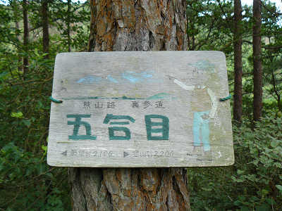 蹄岩 蹄岩を過ごしいかにも滑りそうな登山道を進めば、擬木の階段が現れる。この擬木の階段を登れば間もなく五合目の展望台に到着した。熊山駅から2200m、山頂の展望台までは2100mと案内されている。