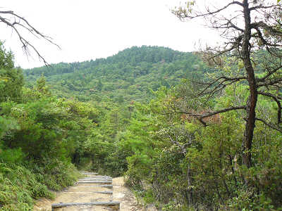 一本松 途中には石段状の場所もあり、なかなか変化に富んだ登山道が続いている。南へは熊山の山頂らしき山容が広がり、いよいよ目指す山を確認することが出来た。周囲には赤松が多く、赤松峠と言われる所以だろう。快適な登山道を進めば左に本四連係線の巡視路を過ごし、熊山登山道の案内に安心して歩くことが出来る。
