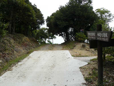 見晴台まで270mの整備された指導標に従い、未舗装林道を進むとすぐにコンクリートで整備された遊歩道が現れる。もう少し進めば見晴台への遊歩道の指導標が立ち、遊歩道は直進方向と右方向に分岐する。どちらの道を通っても最後に合流するのだが、この時点では合流することがわからず、直進方向の遊歩道を取ることにした。なお、右の遊歩道は最近整備されたようでとても歩きやすくなっている。