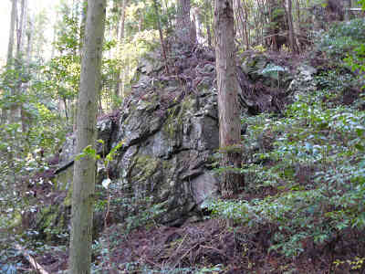 この分岐を左折し、舗装された林道宮ヶ谷線を東へ進む。足下に落ち葉を踏みしめながら進むと、周囲には日差しを浴びた自然林や植林帯がとても明るい。林道横には断層も露出しており、珍しい自然の節理を見学することができる。