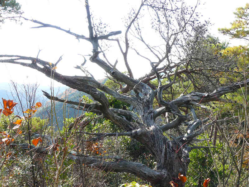 平坦な尾根道の先には展望岩が待っており、東方面に展望が広がっている。この展望岩から枯松と雲霞山の風景を眺めるのはすでに3回目だが、何回見ても素晴らしい。展望岩を出発、少し坂を下り平坦な登山道を進んだ先で、岩場を登り返せば、懐かしい枯松大樹に到着。青空をバックにした枯松は素晴らしいの一言に尽きる。また、風当たりの強い尾根に枯れたままでも倒れず残っている姿には感動さえも覚える。