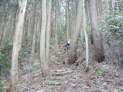 足下に岩が目立ち始めると進路は少し左へ向き、谷の中に入ると周囲の植生は自然林から植林帯へと変化する。おむすびのような岩を過ごすと、ますます坂の傾斜が増し、足を滑らさないよう細心の注意を持って高度を上げる。