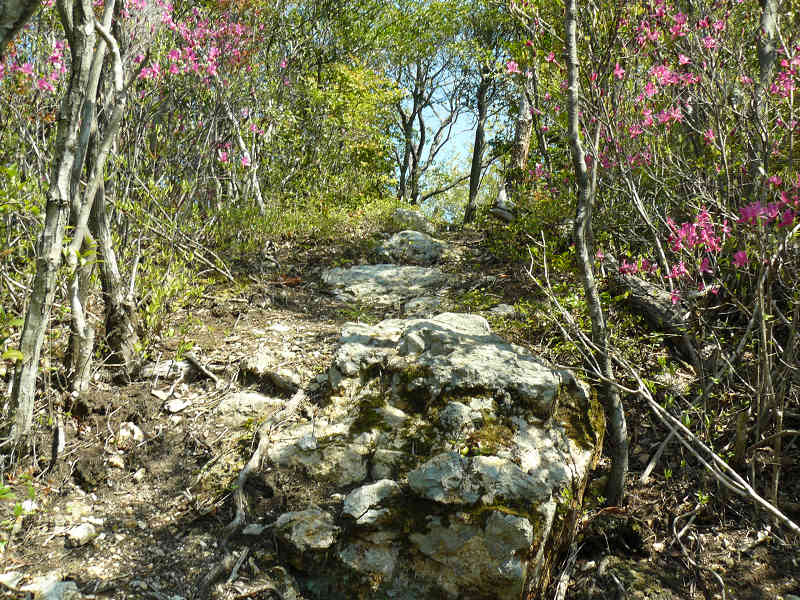 左右に竹林を見ながら進むと明るく開けた場所に出る。登山道は相変わらずよく整備されており、とても歩きやすい。要所に配置された仏経山への案内を確認しながら登っていると右下に池を見る。手前にはこの時期の花の三つ葉ツツジが美しい。やがて中国電力の巡視路標柱が現れる。この巡視路が鞍掛山への登山道である。