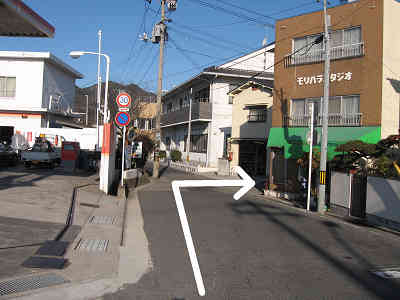 国道185号の興亜橋を渡り、ガソリンスタンドを左手に見て左折、右手に写真館を見て右折すると写真館の反対側の家の壁に健康への道100選の標識を過ごす。この付近には黒滝山への登山口標識が立ち並び、迷うことはない。そのまま道なりに進むと正面に黒滝山を見て道は緩やかに右にカーブしている。この付近にも登山口の標識が並んでいるのでとても助かる。