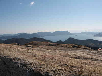 八畳岩は本当に大きな岩で、沢山の人が岩の上でくつろいでいる。八畳岩の上に立ち、瀬戸の展望を楽しむ。南には四国の大三島、その左手には多々羅大橋で繋がった生口島が続いている。この後時間があれば生口島の観音山(火滝山)に向かう予定にしている。今日は黒滝山・白滝山・火滝山と登り続けるつもりである。その先遠くには四国連山が続いており、今日は素晴らしい展望である。