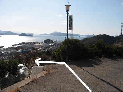 休憩用の東屋、展望台と整備されたひろばにびっくりする。しばらく山頂ひろばで休憩を取った後、もう一度下山道に向かおうかと迷ったが、素晴らしい展望を楽しみながら下る誘惑には勝てず、そのまま瀬戸を眺めながら来た道を引き返すことにした。