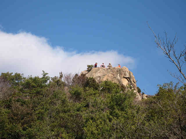 展望所から瀬戸の展望 展望地を出発、いざ岩峰へと進んでいると遊歩道は石段道に変わり、右手になにやら大きな岩を見る。標識を見てみると長寿の亀岩、本当に亀のような岩が座っている。ここで眼下の展望を眺めるため後ずさりをすると岩につまずき、典型的な尻餅をつく。あいたた・・・油断大敵だ。おしりをさすりながら先に進む。