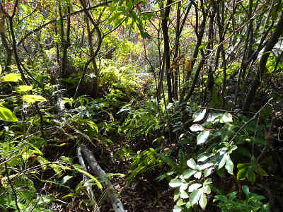 更に緩やかな傾斜の坂を登れば、四等三角点の置かれた黒山山頂に着いた。山頂周囲は樹林の背が高く展望は望めない。また三角点周囲をシダが取り囲んでおり、少し離れると三角点はシダに隠れて見えなくなる。