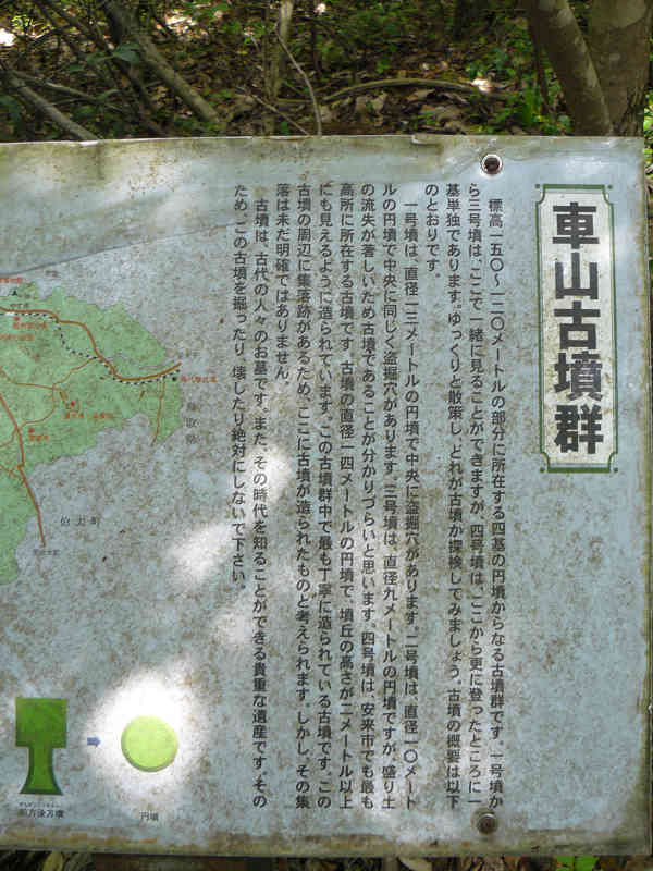 間もなく車山古墳群の案内の建つ場所に到着、ここでは周囲の古墳を観察することができる。この先から少しずつ坂の傾斜がきつくなり、ロープをつかみながら進めば、間もなく「もう一息」の木柱を過ごす。周囲に展望は無いものの、美しい新緑を眺めながら高度を上げれば、間もなく西のピークへ到着する。ただし、西のピーク付近は樹林に覆われ、展望を得ることはできない。