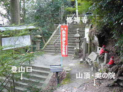 整備された階段をのんびり登り、高度を上げる。右に柴燈護摩道場を過ごした先からは、急な坂を折り返す。意外とこの坂の傾斜がきついので、やはりのんびり登るのがよい。約30分で修禅寺と狗留孫山・奥の院の分岐へ到着、まずは山頂へ向かって分岐を右折する。