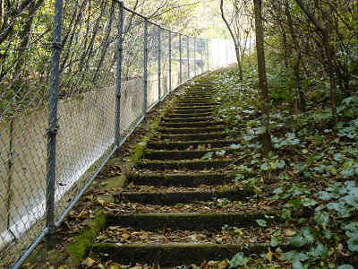 今から向かうのは桜谷遊歩道(登山口)で、入口には「うるしが谷遊歩道」は林道新設工事に伴い、2014年1月14日まで通行止めと案内されている。さて、登山口より擬木の階段を進むと左に沢が現れ、更に進むと植林帯の中へ入る。石組みの残る道を進んでいると、左はフェンスによって仕切られ、間もなく長い階段の前に着く。
