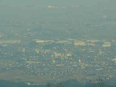 九千部山の山頂風景 展望台からは、周囲に林立するアンテナは当然のこと、鳥栖市街の展望が広がり、大きな商業施設などが見えている。背後にはレーダー施設の置かれた背振山も見えているが、少し霞気味である。明るい山頂でのんびり休憩の後、石谷山コースの案内に従い、少し先のアンテナの建つ場所まで移動する。