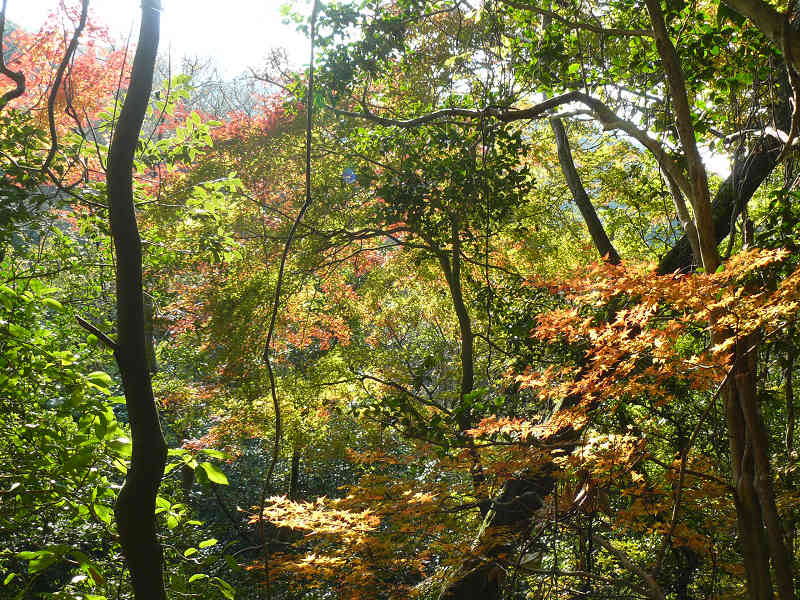 いつの間にか頭上は自然林に変わり、美しい紅葉観賞が続く。山頂まで2kmを切ったところで、擬木の階段を登ると左に明確に残っている炭焼きの跡を見つける。丁度木漏れ日が差しているので、炭焼き跡の全体像をはっきり確認することができた。