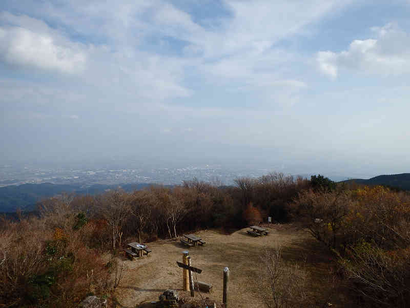 左にアンテナ施設を過ごし、左にフェンスを見ながら道なりに進む。この付近には多くのアンテナが林立していることを実感する。この先で一旦左右を自然林に挟まれ、目の前が開けると、三階建ての展望台の建つ九千部山の山頂へ到着。展望台手前には低い小山があり、ここに二等三角点が置かれている。