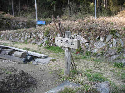 県道192号と合流する手前の左手に分岐する道を左折する 県道192号側から見ると元折バス停の先に小古祖・八坂への標識に従って右折することになる。元折川の上流に向かって進んで行くと左手のコンクリートの角に文珠岳と「めだかの養殖場」の標識、その下には石柱を見ることが出来る。 この右手に広い場所を見つけたので車を置き、向かいの大師堂に参拝、登山の無事などをお願いし、いよいよ登山を開始する。